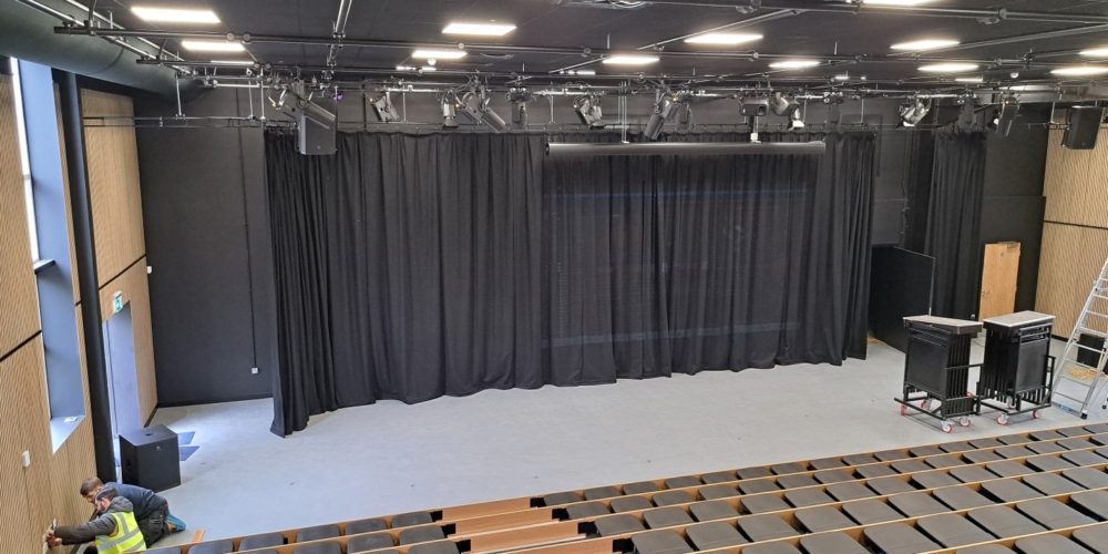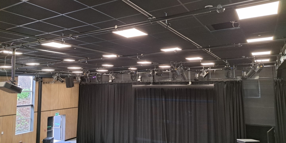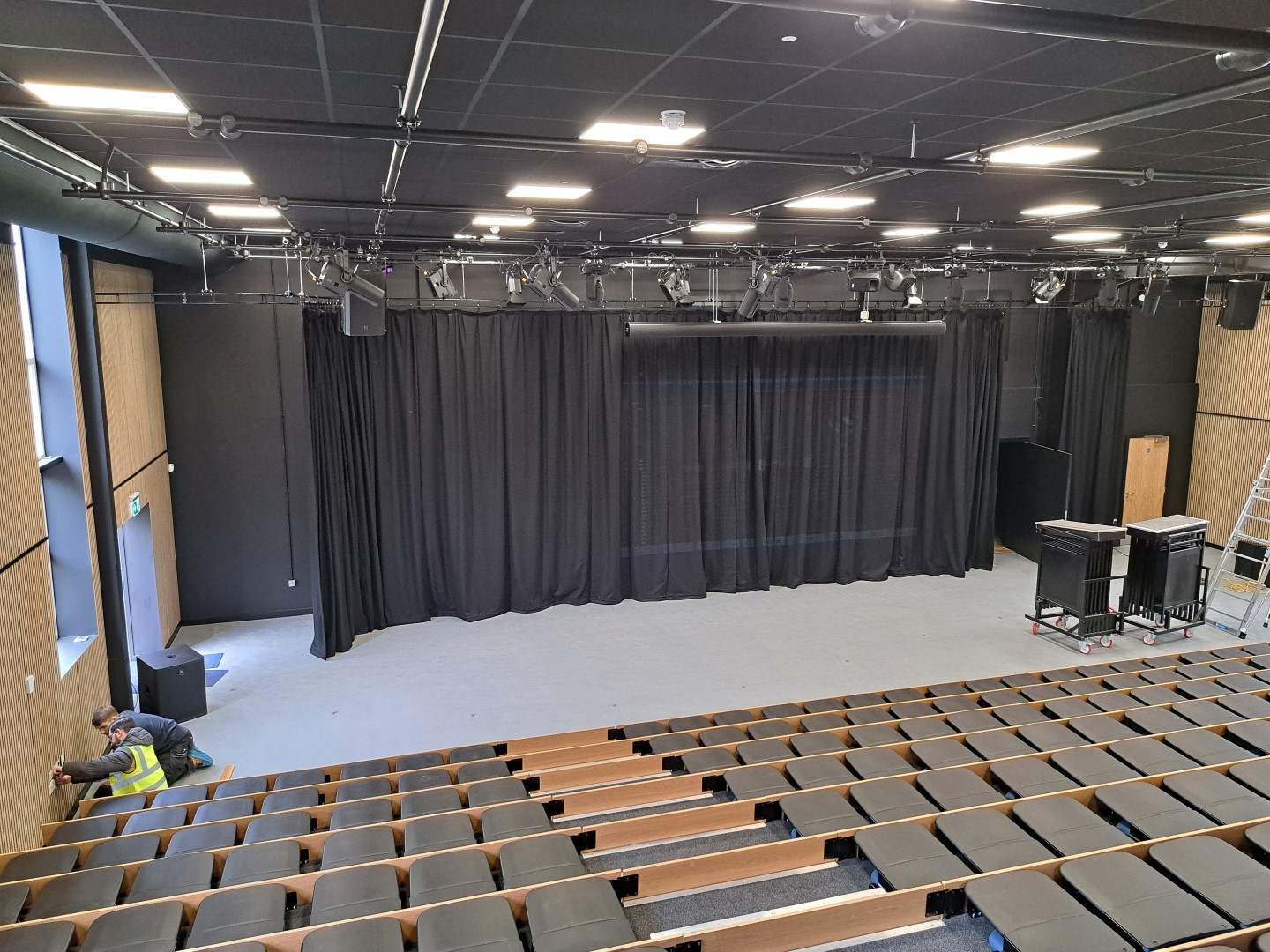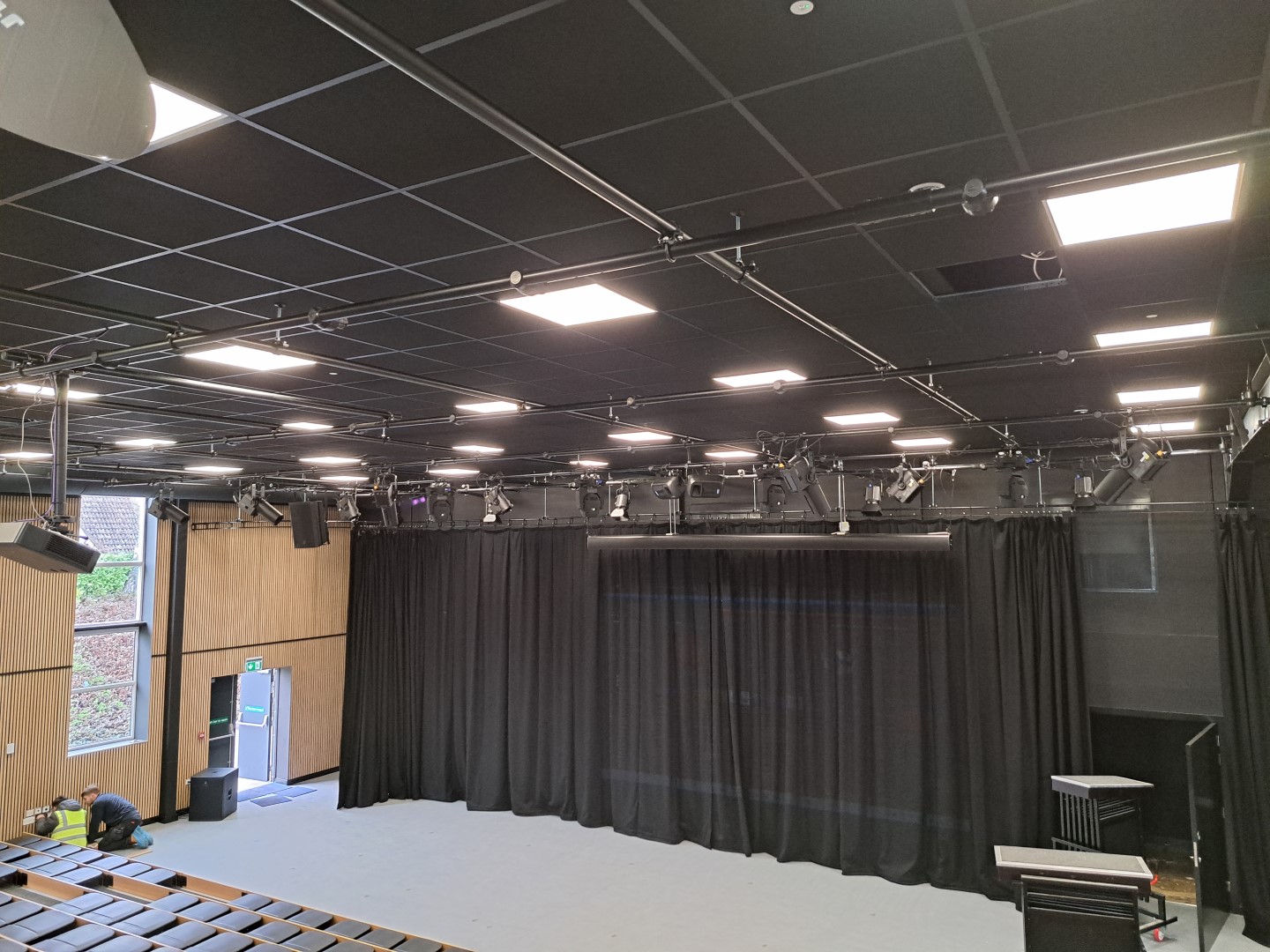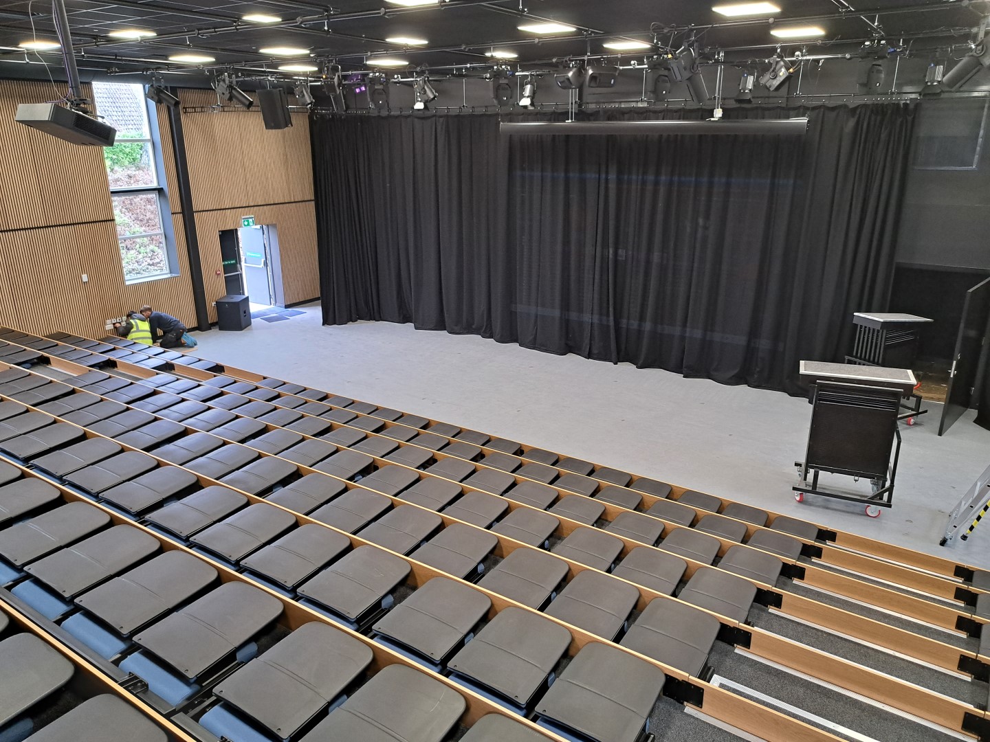 Originally a dated assembly hall and music room, the building was stripped back to its original structure with some major structural works required of which included a new steel goalpost to the theatre room. A steel mezzanine floor was also formed to house the control room, stores and plant room. The existing external walls were lined with an acoustic panelling to assist with the acoustics for the room. Externally a new large AHU was installed along with fencing and EV chargers to the existing car park.