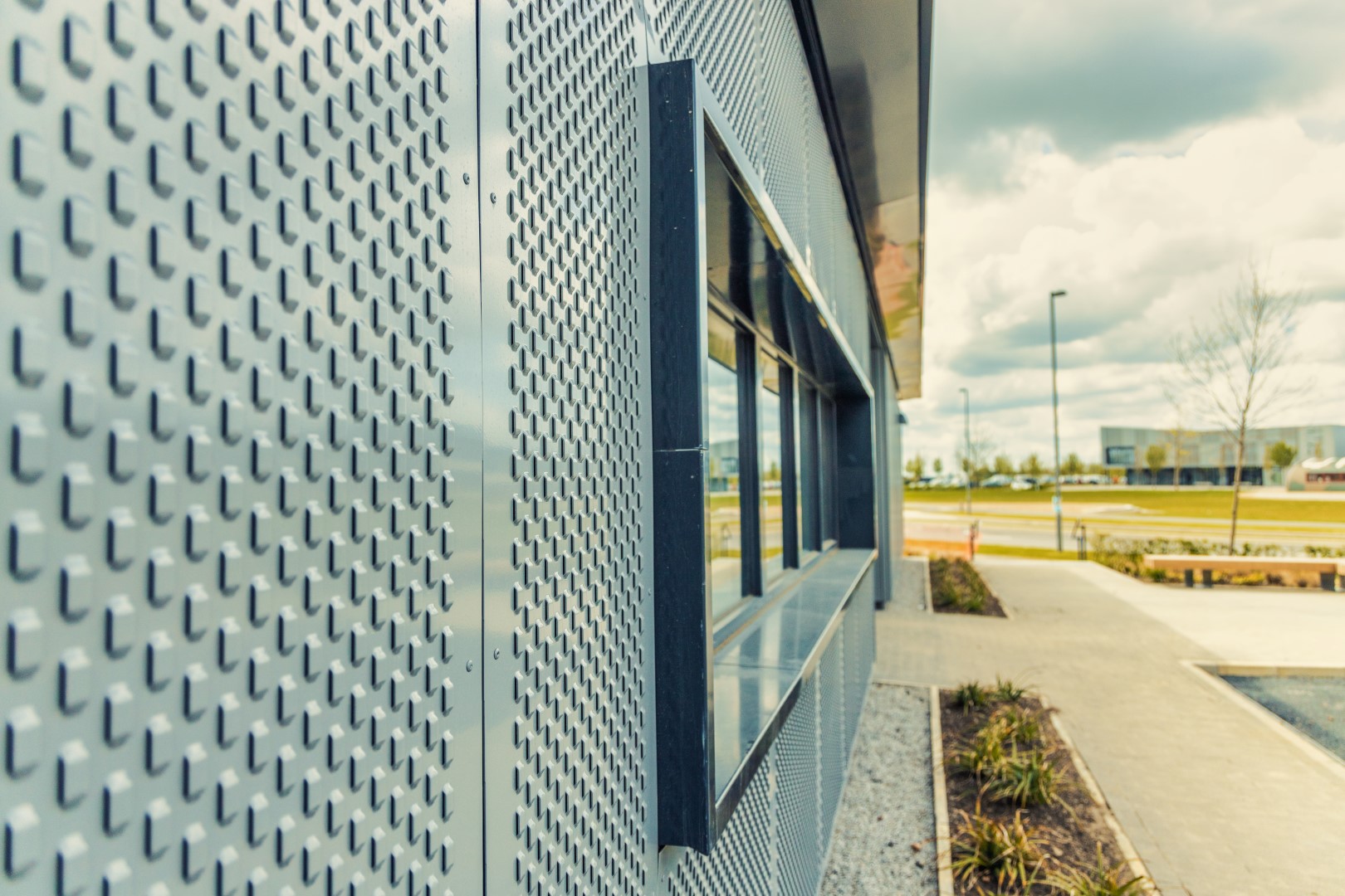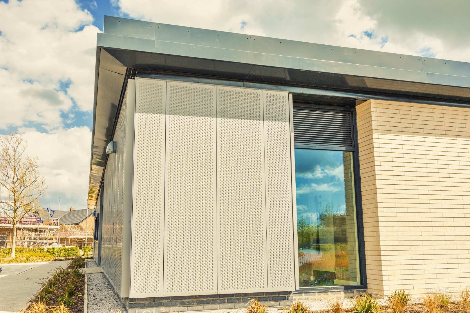 The façade of the building was split into two different type of materials, these being a Forticrete brick and an Aluminium rain screen cladding and covered by a flat roof design.